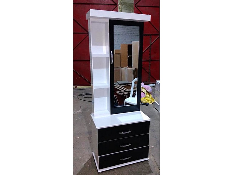 Moderno mueble en forma de L con un elegante contraste entre blanco y negro, ideal para complementar y organizar tu espacio con estilo.