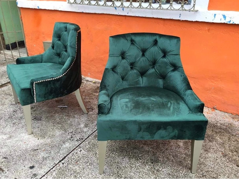 Con una estructura en madera de haya y un asiento generosamente acolchado, estas sillas están tapizadas en terciopelo verde esmeralda, aportando un toque de lujo a cualquier comedor.