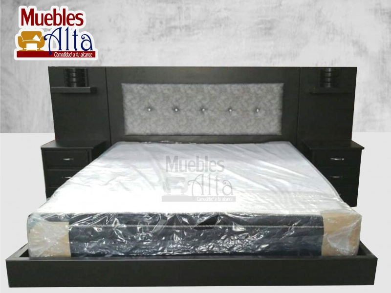 Cama elaborada en su estructura en madera de pino con espaldar tapizado , nocheros.