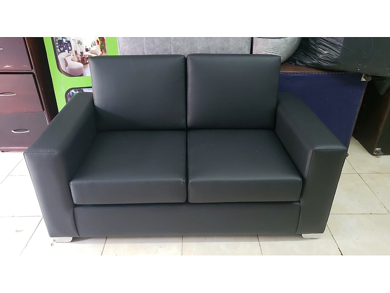 Sofá en cuero sintético color negro de dos plazas para sala de estar.