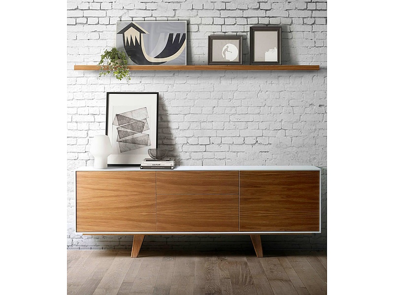 Aparador de diseño bajo con múltiples compartimentos, ideal para almacenar vajillas, manteles y utensilios. Su estilo elegante lo hace adecuado para comedores o salas de estar.