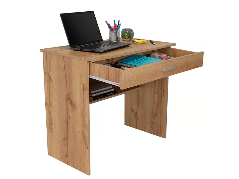 Escritorio de tamaño reducido con un diseño minimalista. Incluye un pequeño cajón para organizar artículos de oficina, ideal para espacios de trabajo en casa.