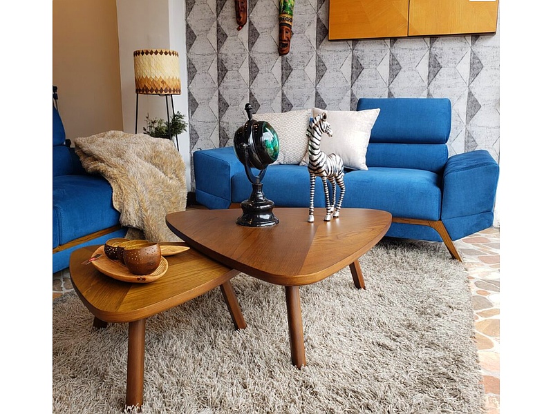 Juego de mesas triangulares en madera con diferente altura.