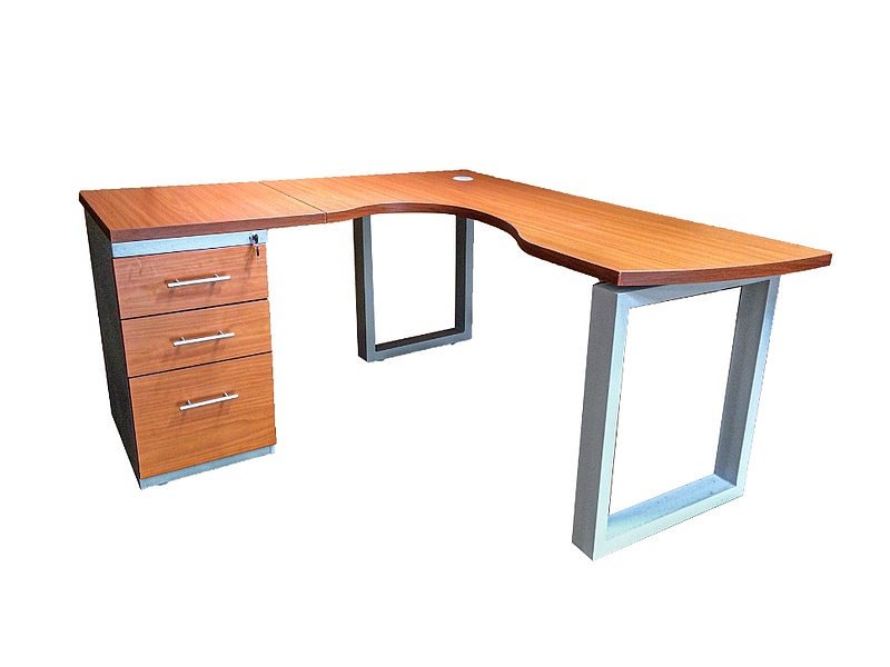 Escritorio en forma de L, ideal para maximizar el espacio en oficinas pequeñas. Su diseño funcional incluye estantes y espacio para organizar documentos y dispositivos electrónicos.