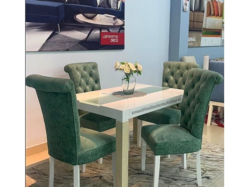 Te enseñamos nuestro hermoso Comedor Bangkok, tapizado en tela con repelencia al fluido, madera cedro y vidrio esmerilado.