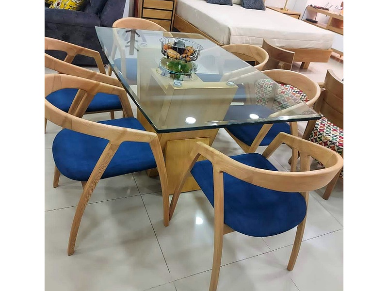 Comedor de vidrio, sillas azules