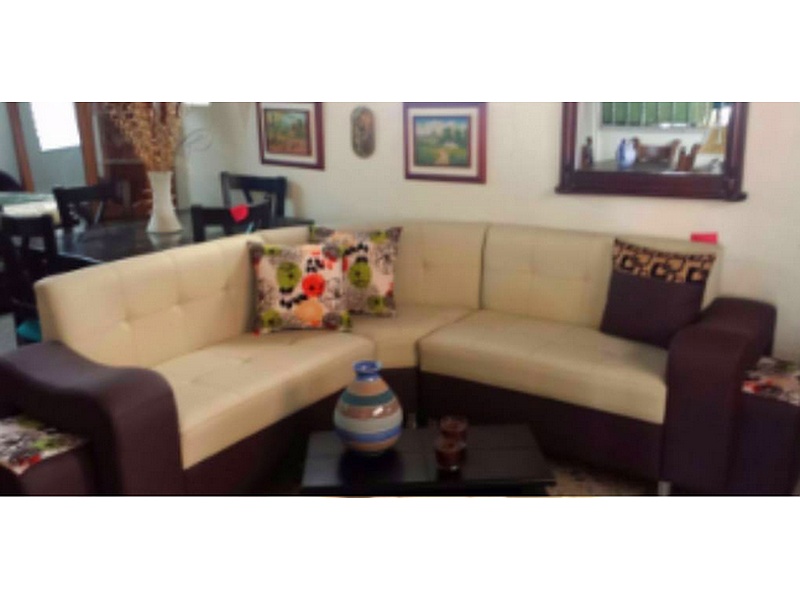 Muebles esquineros en color crema y moca, elegantes.