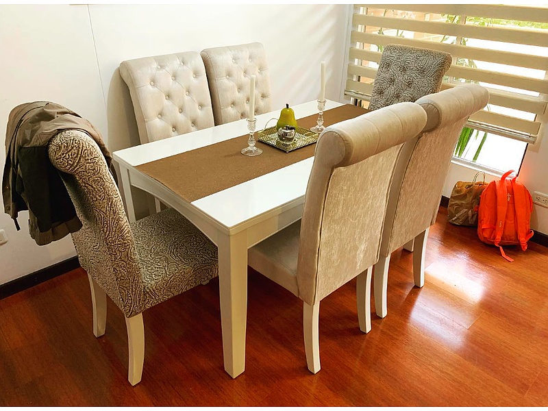 Mesa de forma rectangular para comedor con seis sillas tapizadas.