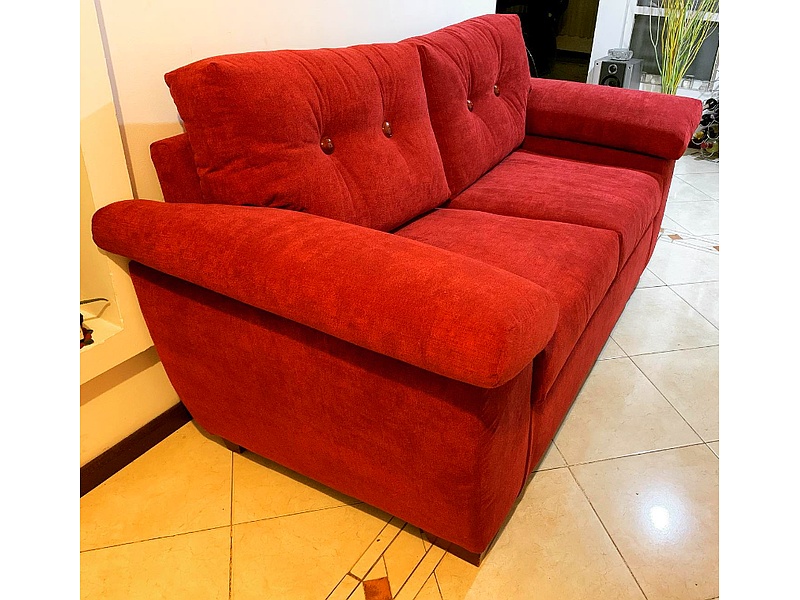 Sofá de dos plazas color rojo tapizado de puntos.