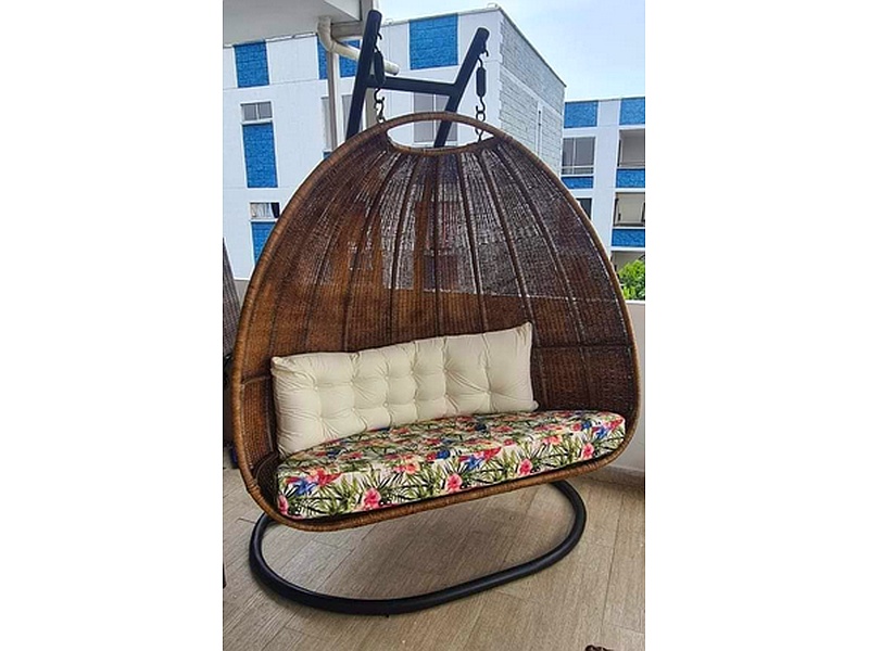 Silla colgante hecha en mimbre natural, cómoda y estilizada.