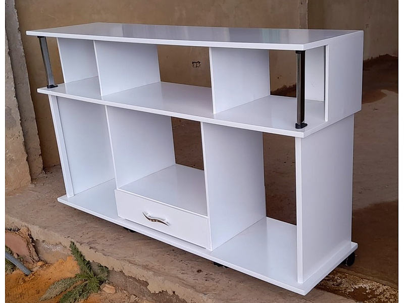 Estante abierto con dos nivele color blanco con un cajón.