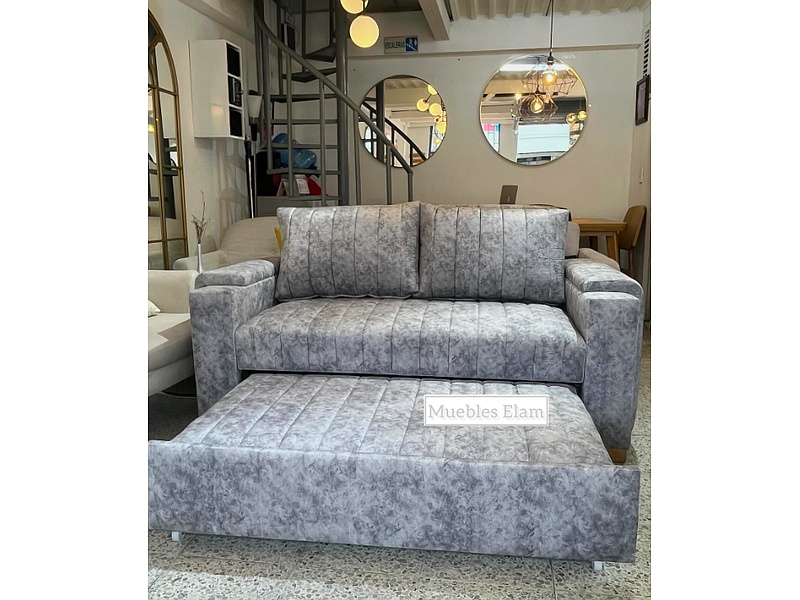 Sofá cama color gris, de dos plazas para sala de estar.