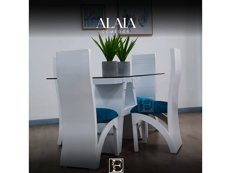 Mesa para comedor de vidrio con cuatro sillas color blanco.