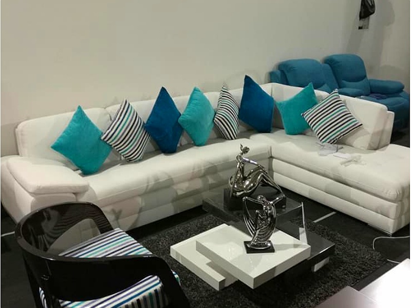 Set de muebles en blanco con cojines turquesa, combinando frescura y elegancia. Ideal para un ambiente moderno y relajante.