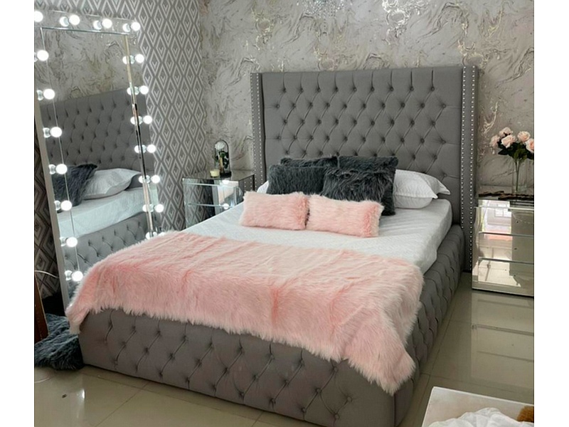Cama estilo capitoné en color gris, con un diseño elegante y sofisticado.