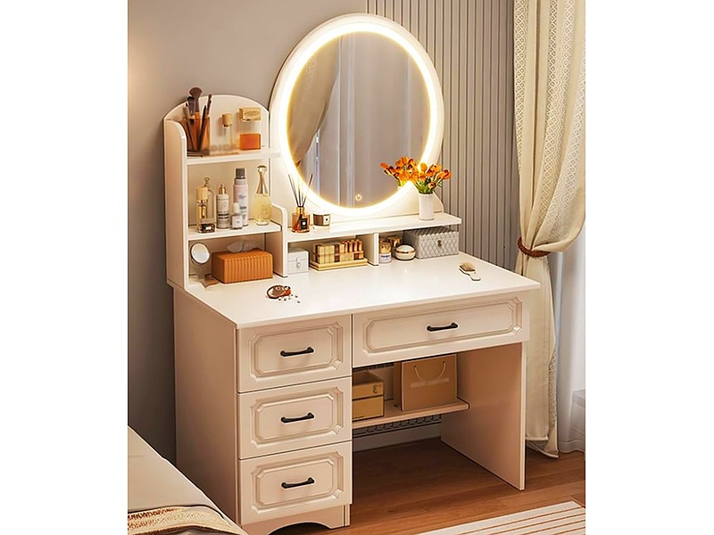 Una cómoda espaciosa con varios cajones y un espejo grande montado en la parte superior. Perfecta para almacenar ropa y accesorios, combinando funcionalidad con un diseño elegante.