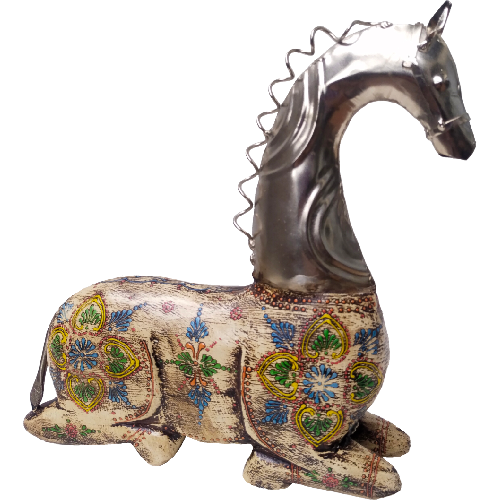 Caballo sentado en madera pintado tipo Mendhi con cabeza en metal.