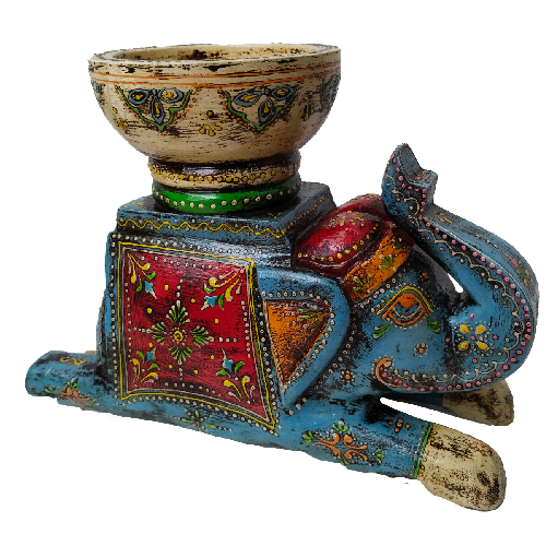 Elefante pintado inspirado en el Mehndi, una forma tradicional de arte corporal que utiliza una pasta de henna para crear diseños temporales en la piel. La figura se encuentra con las patas extendidas al suelo, la trompa elevada y una vasija en el lomo.