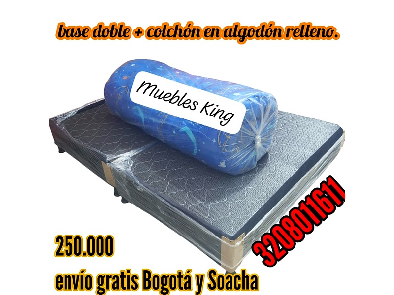 Disfruta de un descanso inigualable con nuestra base cama y colchón relleno de algodón suave y transpirable. Con un precio de $250,000, esta oferta incluye envío gratis a Bogotá y Soacha, y 1 año de garantía. ¡No pierdas esta oportunidad de mejorar tu descanso! Compra ahora y experimenta la comodidad perfecta que te mereces.