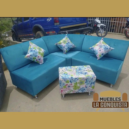 Este elegante sofá esquinero en color azul es una adición sofisticada y moderna a cualquier sala de estar. Su diseño esquinero aprovecha al máximo el espacio, proporcionando asientos cómodos y funcionales. El sofá está complementado con cojines cuadrados que presentan un encantador diseño floral, añadiendo un toque de frescura y estilo al conjunto. Los cojines estampados en tonos que complementan el azul del sofá aportan un contraste vibrante y atractivo, haciendo que el sofá no solo sea cómodo, sino también un elemento decorativo clave en la habitación.