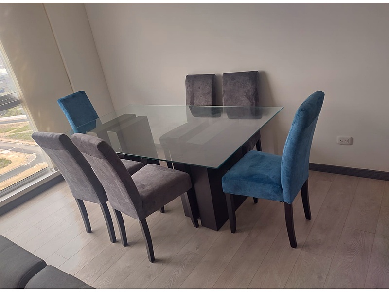 Mesa de comedor rectangular de vidrio con seis sillas.