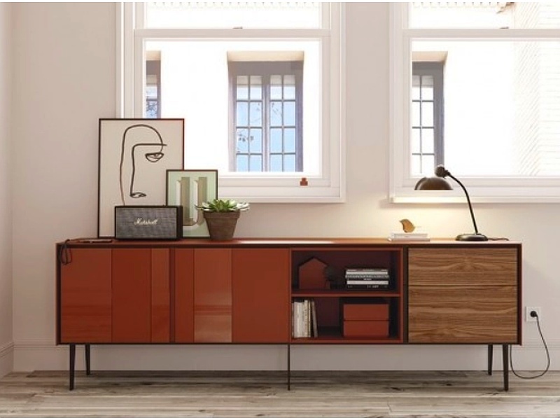 Aparador de diseño bajo con múltiples compartimentos, ideal para almacenar vajillas, manteles y utensilios. Su estilo elegante lo hace adecuado para comedores o salas de estar.