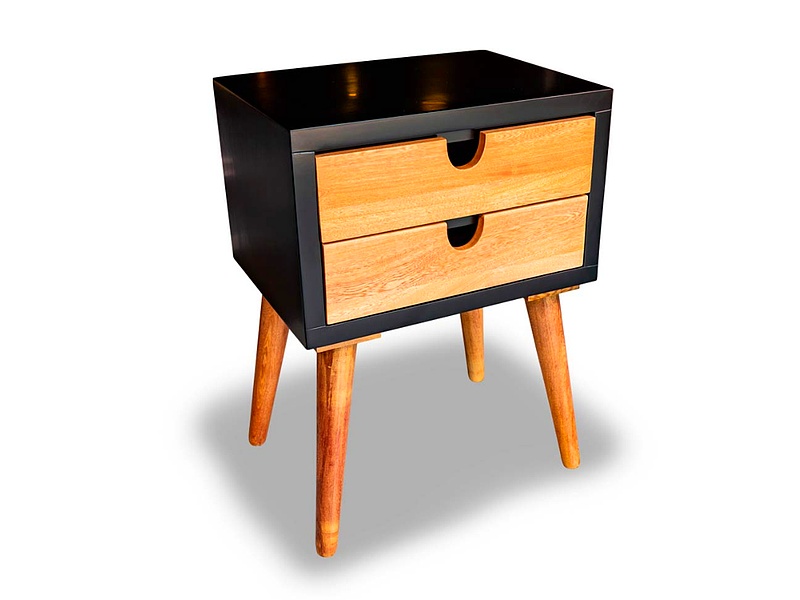 Mesa auxiliar compacta diseñada para colocar junto a la cama. Incluye un pequeño cajón y una superficie superior para lámparas, relojes o libros.