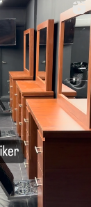 Cómodas de madera con espejo para salón de belleza, diseñadas con cajones amplios para almacenamiento. Su acabado en madera natural o lacada aporta un toque cálido y elegante, mientras el espejo grande integrado brinda funcionalidad y estilo, ideal para crear un espacio organizado y sofisticado.