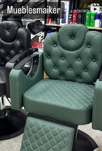 Silla reclinable verde para peluquería, con un diseño moderno y tapizado resistente. Ofrece ajuste de respaldo y altura para mayor comodidad del cliente. Ideal para brindar un toque de estilo y confort al salón.