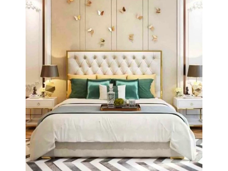 Pieza de mobiliario que irradia sofisticación y lujo. El acabado blanco brillante aporta luminosidad, mientras que el marco dorado añade un toque de glamour. El cabecero acolchado con botones no solo ofrece comodidad, sino que también enriquece el diseño con un detalle clásico.