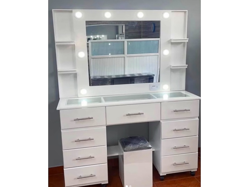 Pieza elegante y funcional, perfecta para añadir un toque glamoroso a cualquier habitación. Su diseño minimalista incluye un amplio espejo y múltiples compartimentos para el almacenamiento de maquillaje y accesorios, permitiendo una organización eficiente.