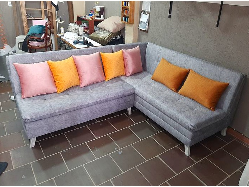Sofá esquinero color gris, tapizado de puntos para sala de estar.