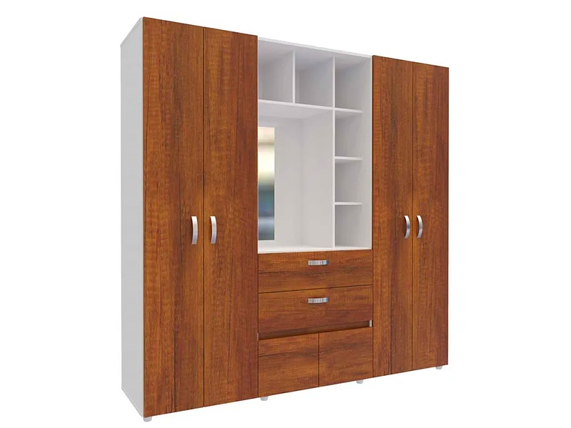 Un armario ropero amplio y funcional, con cuatro puertas y un espejo central. Incluye estantes y barras para colgar ropa, optimizando el espacio y ofreciendo un diseño elegante.