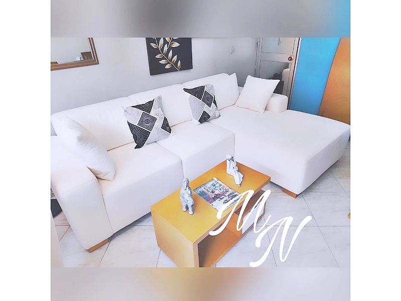 Sofá color blanco de tres piezas en forma de L para sala de estar.