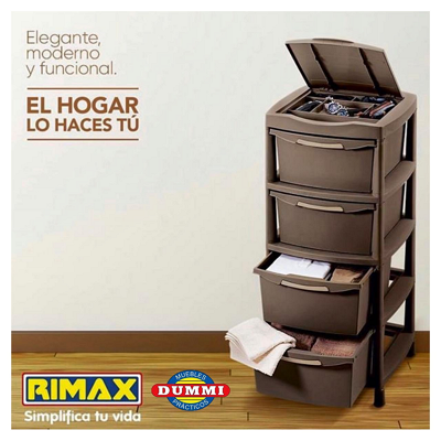 La cajonera Rimax es un mueble de almacenamiento funcional y duradero, fabricado en plástico resistente. Ideal para organizar documentos, suministros y otros artículos, ofrece múltiples cajones para una distribución eficiente y es fácil de montar y mantener.