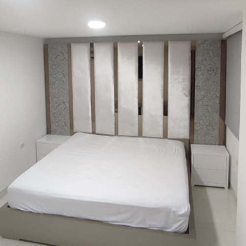 Cama con alerones, cama con espaldar con diseño geométrico con alerones integrados
