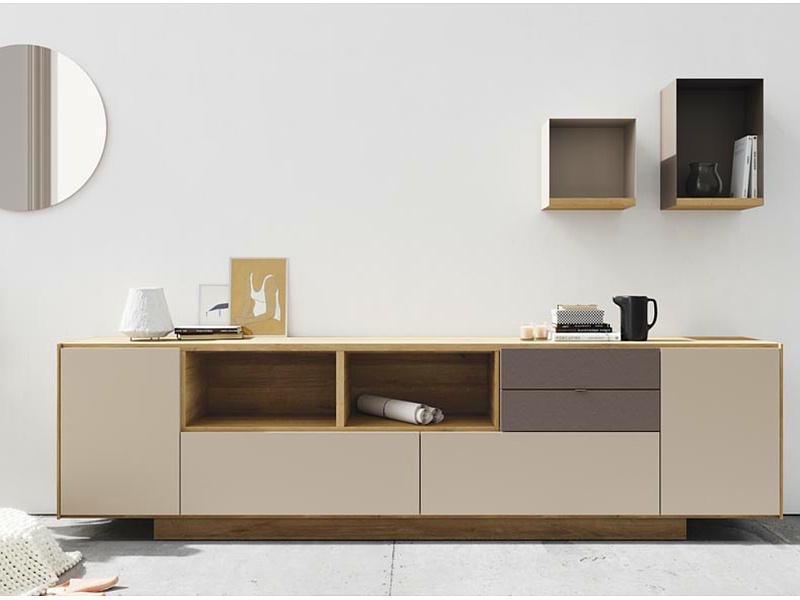 Aparador de diseño bajo con múltiples compartimentos, ideal para almacenar vajillas, manteles y utensilios. Su estilo elegante lo hace adecuado para comedores o salas de estar.