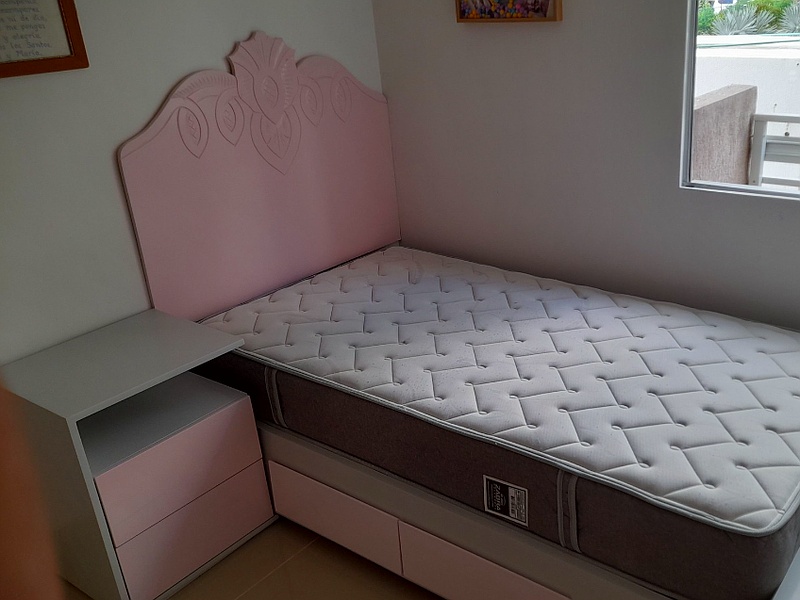 Su diseño moderno con cabecero integrado y estructura resistente en tonos vibrantes, la convierte en una opción ideal para habitaciones juveniles.
