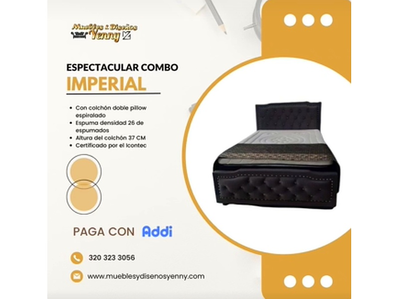 El Combo Imperial ofrece una solución integral para tu dormitorio, incluyendo una base robusta, un elegante cabecero y un colchón de alta calidad. Este conjunto combina durabilidad y estilo, creando un ambiente cómodo y sofisticado. Ideal para quienes buscan una mejora completa en el descanso y la estética de su habitación.