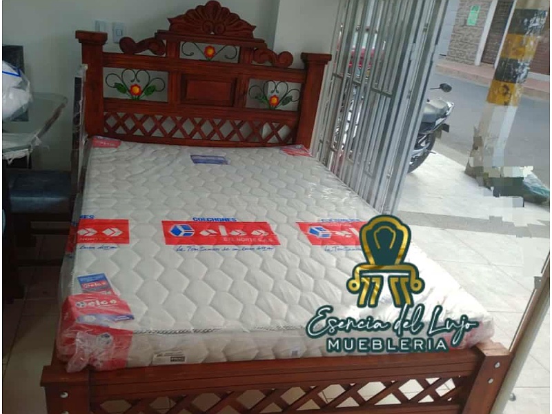Una cama con un estilo campestre y robusto, elaborada en madera maciza con acabados naturales que resaltan la textura de la madera.