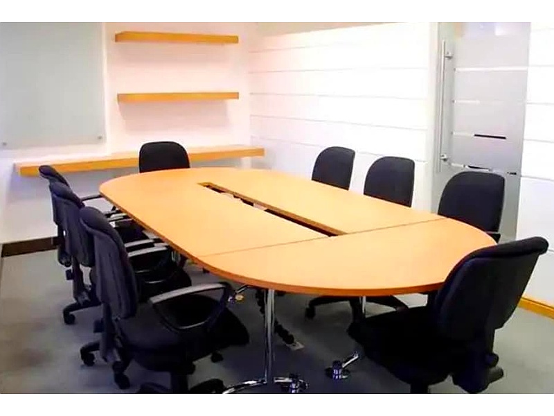 Mesa de juntas para oficinas con ocho sillas.