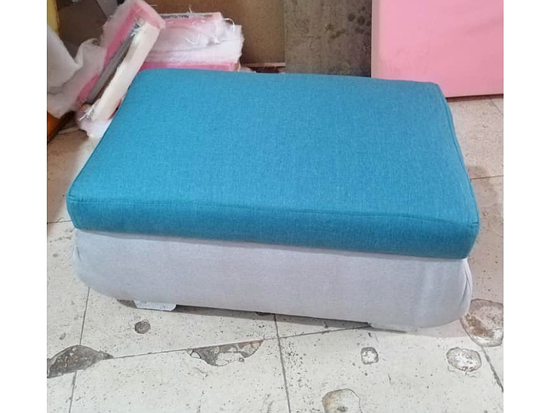 Puff baúl cuadrado color celeste para almacenamiento.