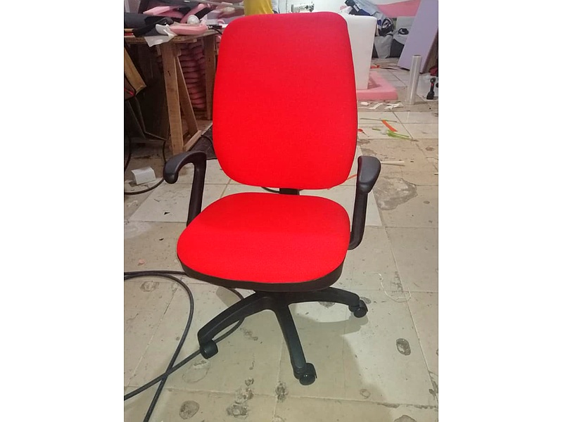 Silla de oficina color roja tapizada giratoria.