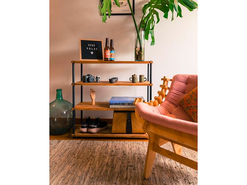 Estantería industrial de madera con soporte de metal y cuatro niveles.
