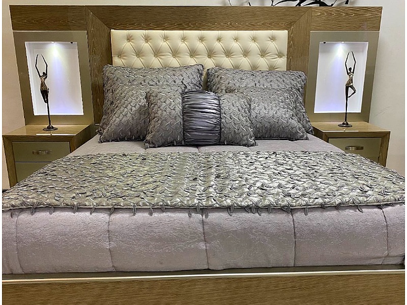 Cama de diseño sofisticado fabricada en madera maciza, acompañada de nocheros funcionales que brindan espacio adicional para almacenamiento. Perfecta para darle un toque de distinción a tu habitación.