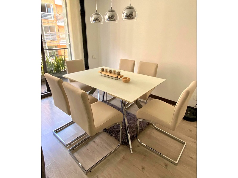 Mesa de comedor rectangular color blanca con seis sillas. Sillas Re tapizadas en cuero vegano, un excelente material que facilita la limpieza.