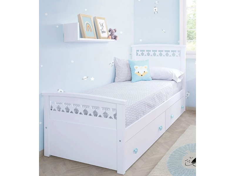 Cama infantil de madera con cajones integrados debajo para almacenamiento adicional. Su diseño seguro y resistente la convierte en una opción ideal para habitaciones de niños.