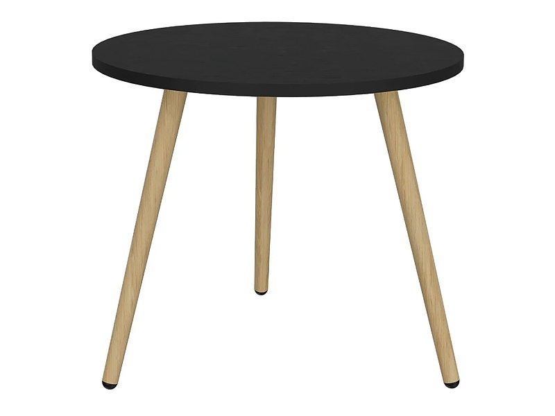 Mesa auxiliar redonda con un elegante acabado en madera y patas de metal. Perfecta para colocar junto al sofá o como soporte para una lámpara decorativa.
