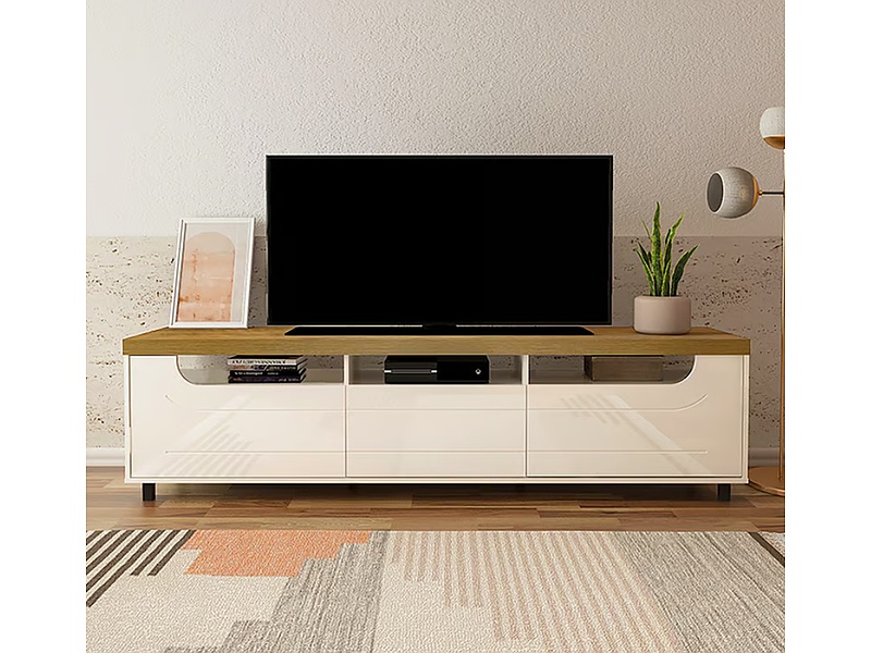Mueble de TV con estantes abiertos y cajones para almacenar equipos electrónicos y accesorios. Su diseño moderno y funcional se adapta a diferentes estilos de decoración.