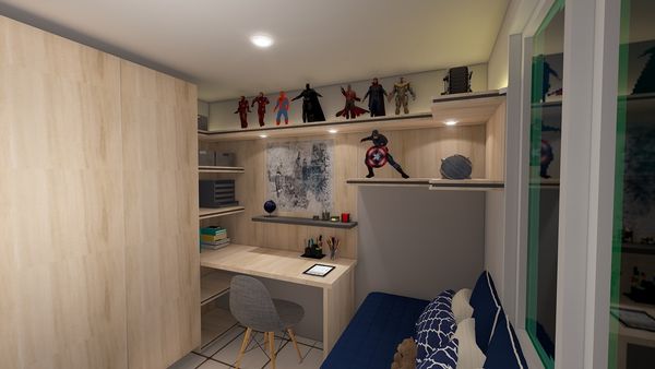 Diseño de interiores para habitacion de niño el cual cuenta con un closets sencillo, un escritorio con múltiples repisas y entrepaños iluminados con cinta led cálida indirecta para dar un contrate con la luz principal de la habitación.